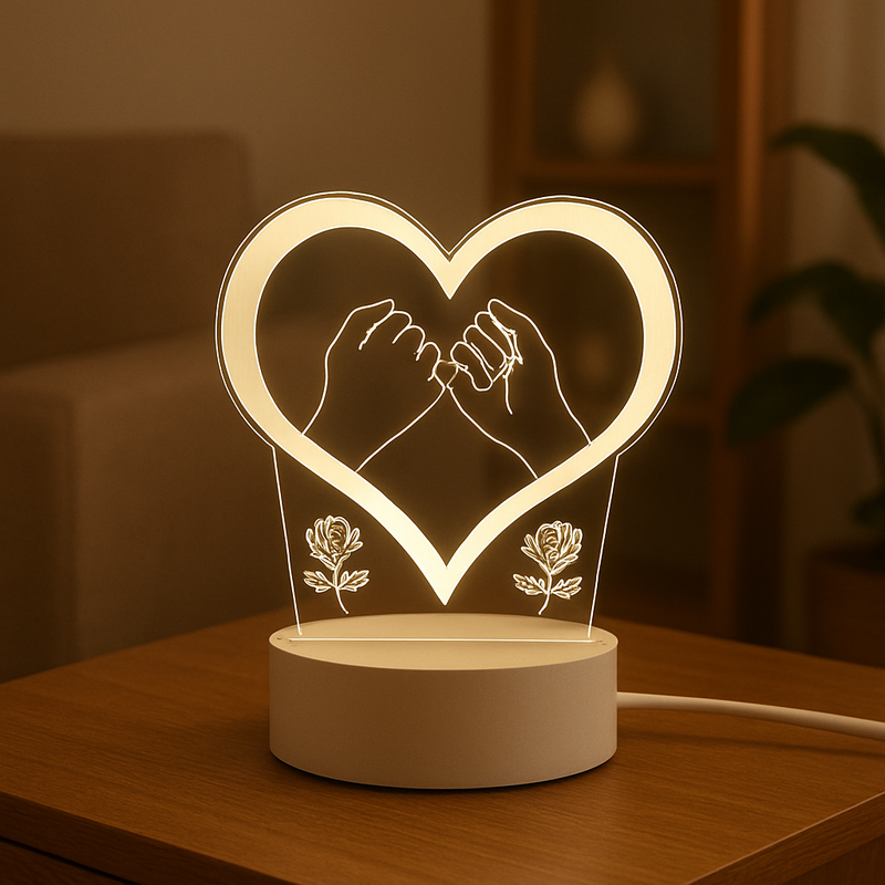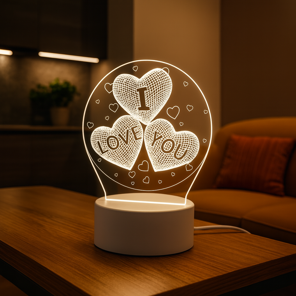 LoveGlow™ 3D Lamp emituje delikatne, trójkolorowe światło, które wypełnia pomieszczenie przytulną i relaksującą atmosferą. Idealna do wieczornego odpoczynku, czytania czy romantycznych chwil we dwoje.